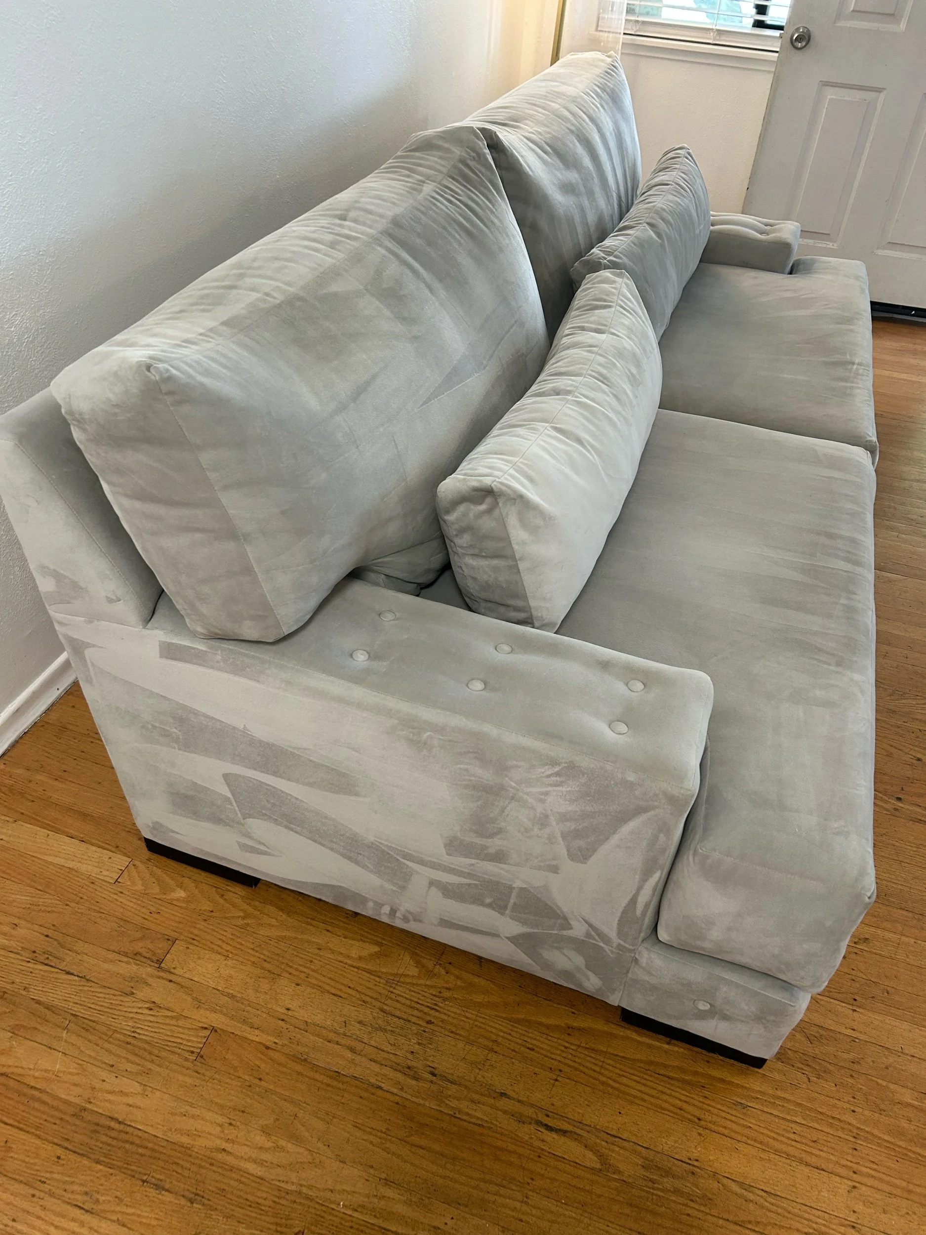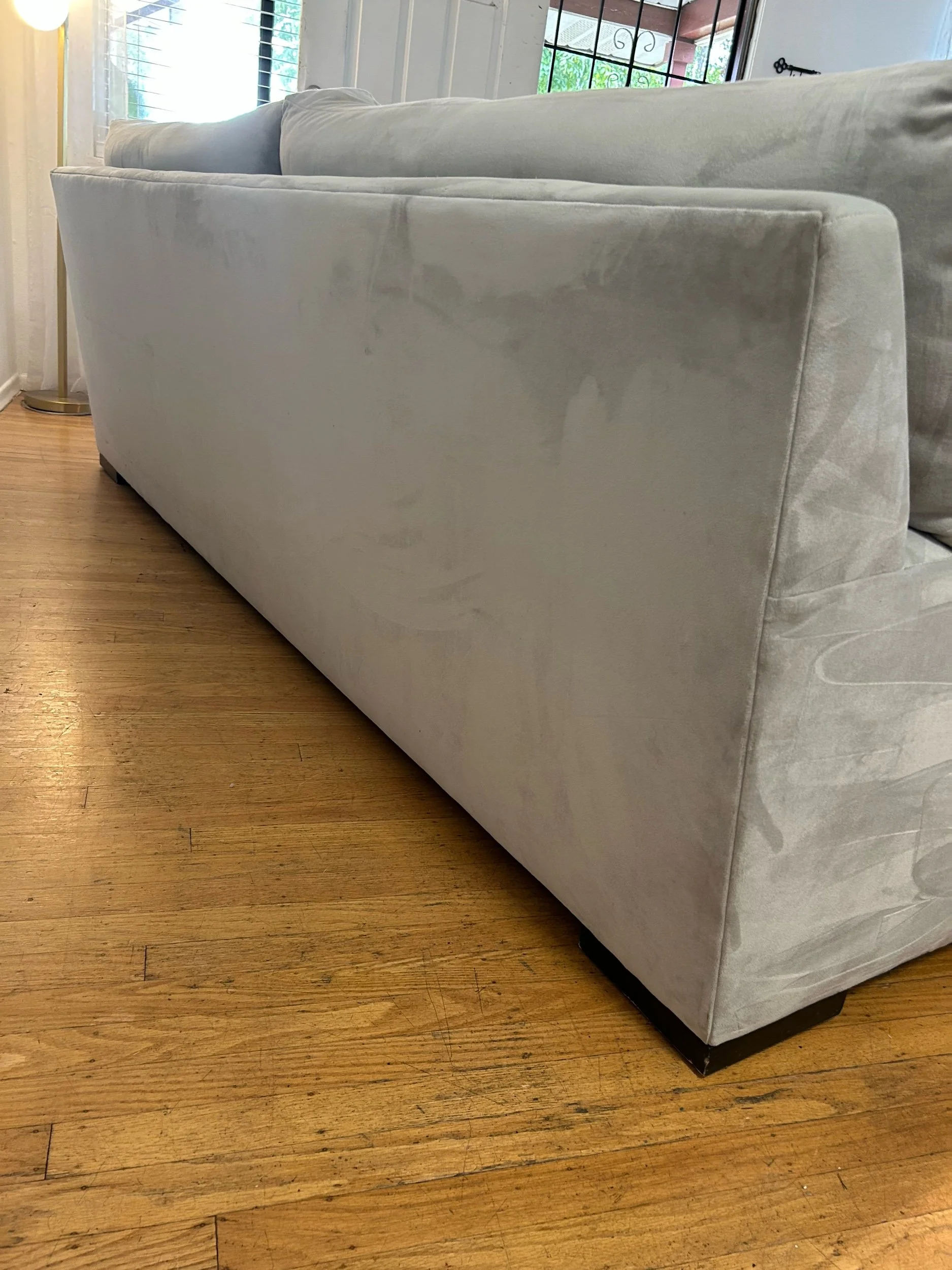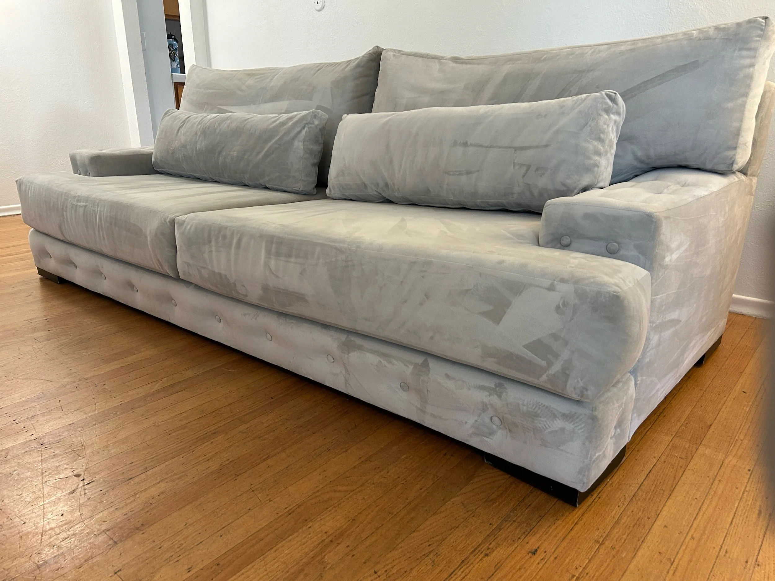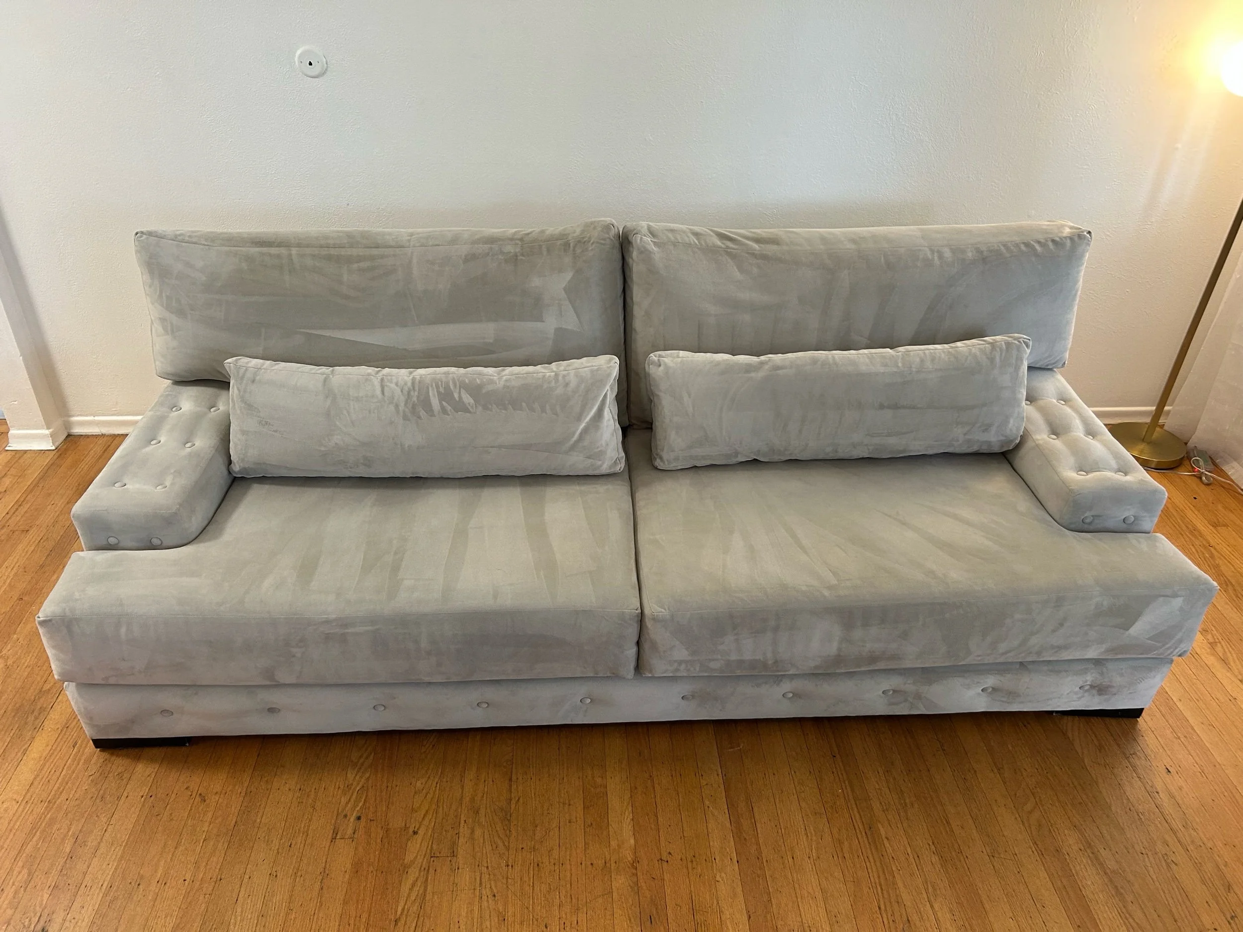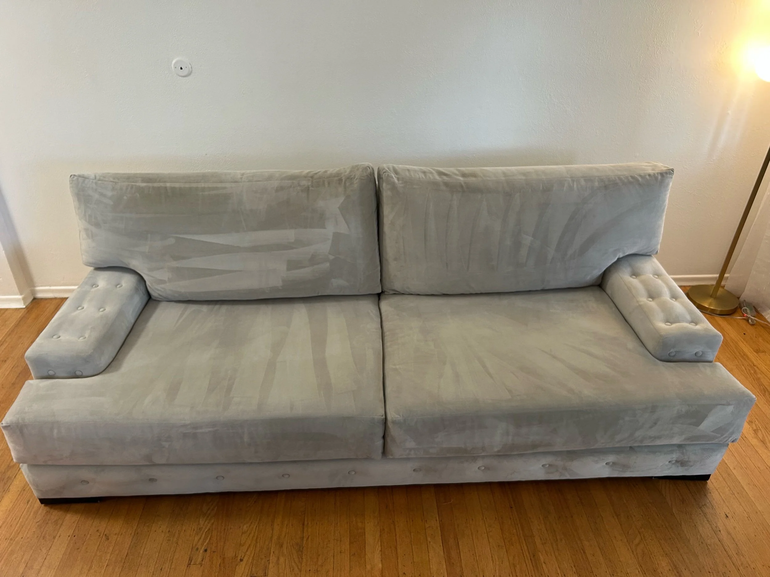 Beautiful and large light grey sofa. Has fun button tufted details on the arms and the bottom front panel. The couch is very comfortable as it's deep and it's clean, easy to keep clean too. The color is light grey/ light blue depending on how you see it. Nothing wrong with it, was used in staging. It's about 2 yrs old. Not sure of the brand but very well made and strong bones, it's heavy.